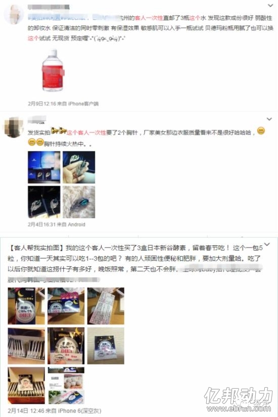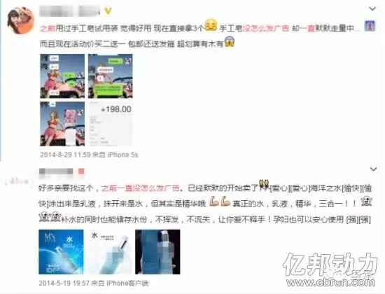 据另一名商家透露,微商圈中还有一种颇为令人混淆不清的,是借用名人之口,移花接木,给微商产品做宣传。这类做法主要利用冲动消费欲,通过名人的言论营造一种气氛,让顾客觉得的确需要这一类型的产品来实现言论中推崇的效果。